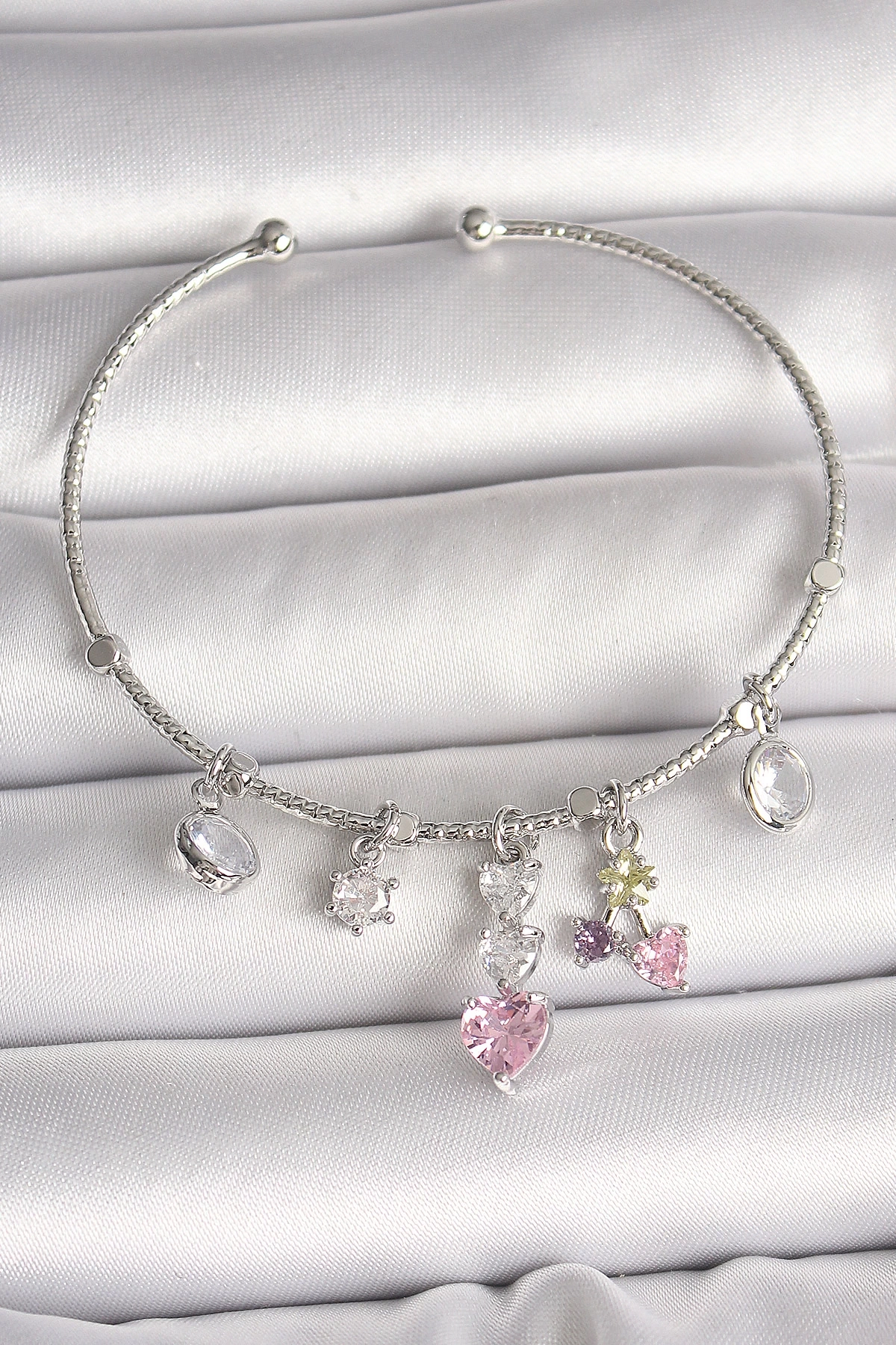 Pirinç Gümüş Renk Sallantı Zirkon Taşlı Kalp Figür Charm Kadın Bileklik